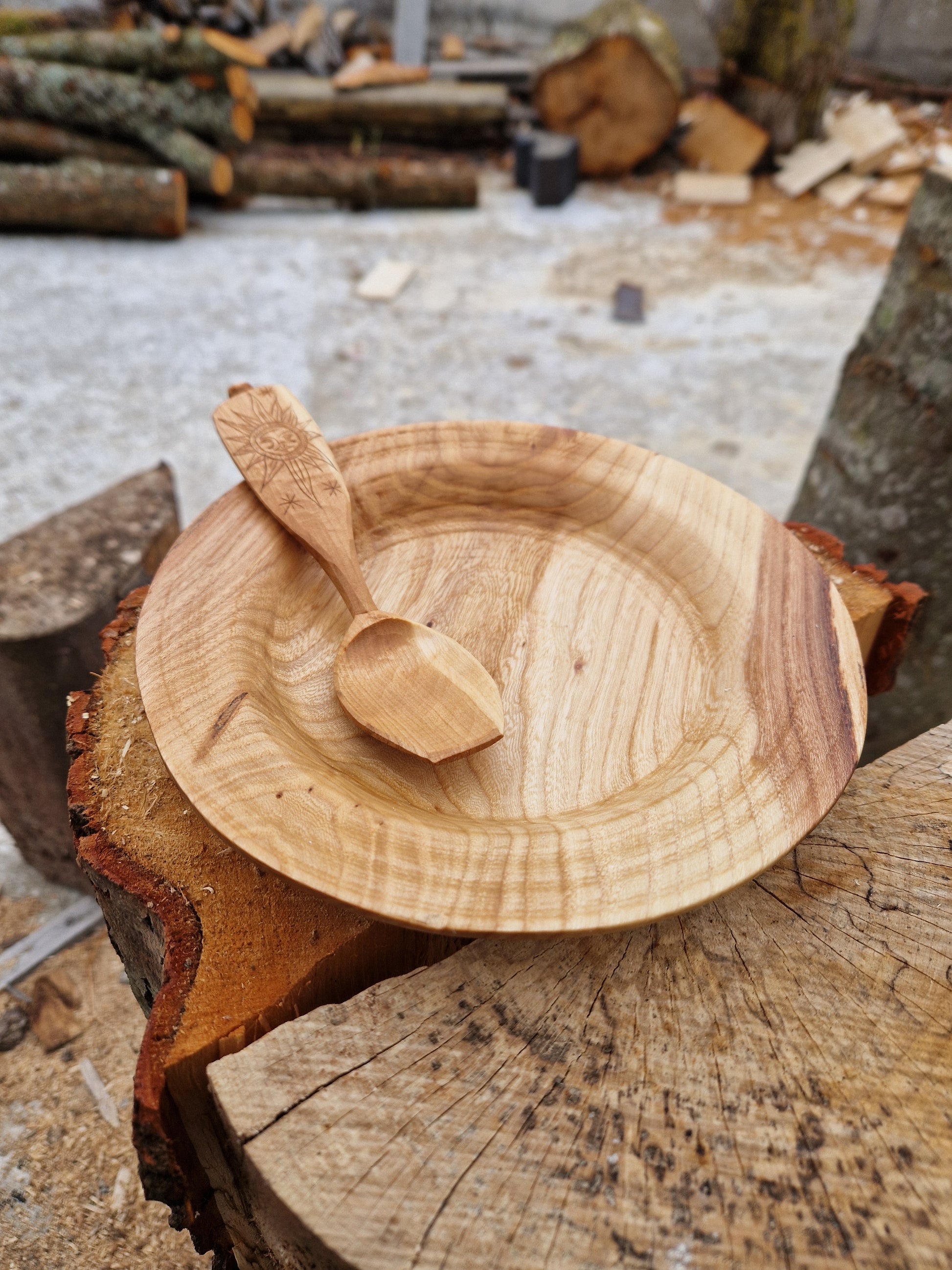 Beautiful hand turned Elm wood dish together with a hand carved cherry wood spoon.