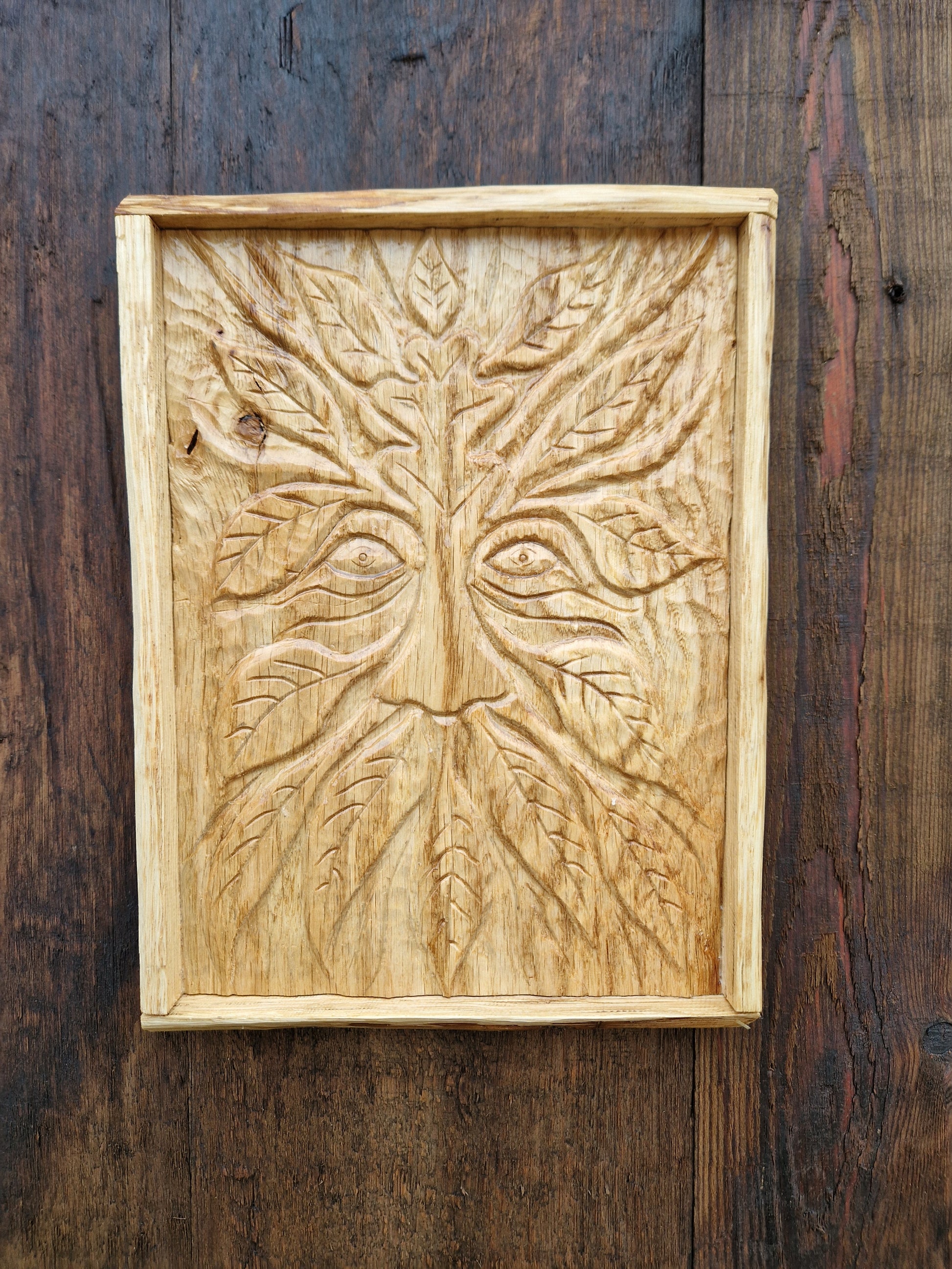 Beautiful hand carved Green man wall plaque, carved from Oak with an oak frame and finished with linseed oil. Size 270 mm x 200 mm